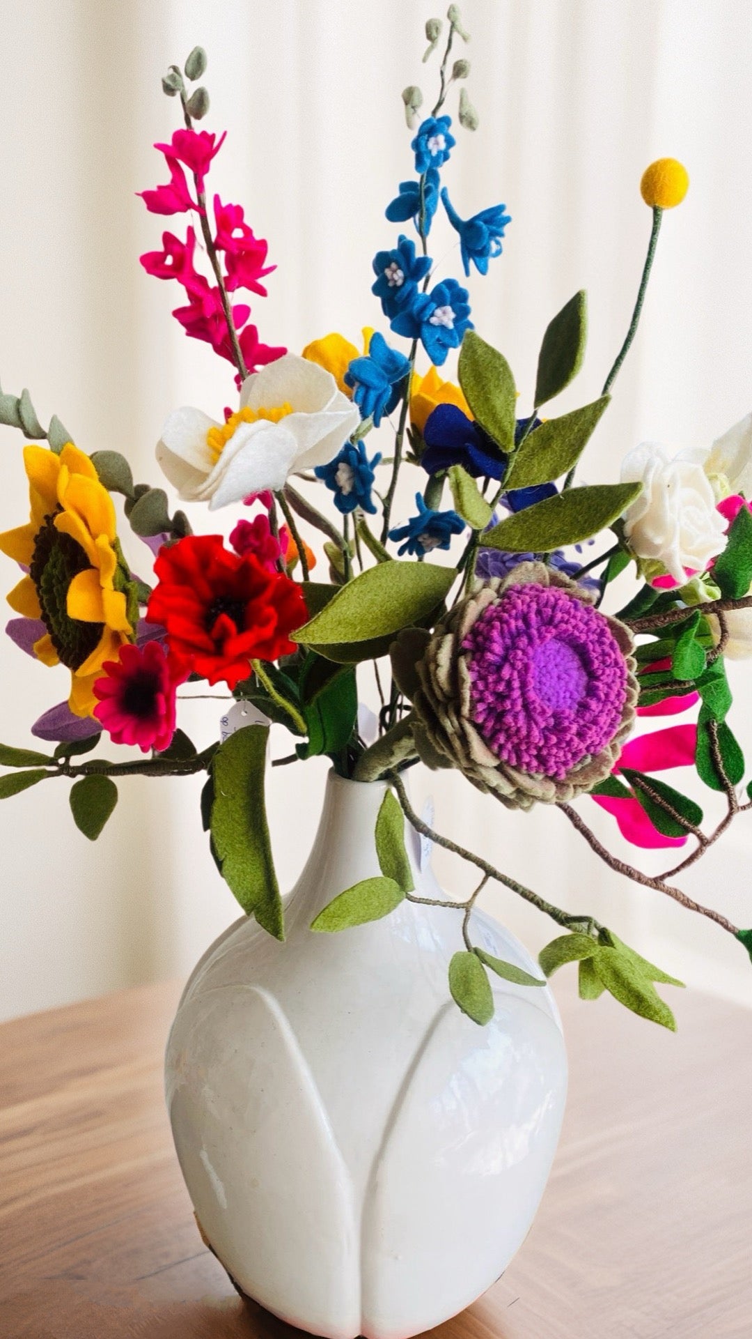 Breng je ruimte tot leven met een handgemaakt viltbloemenboeket dat geen verzorging nodig heeft.