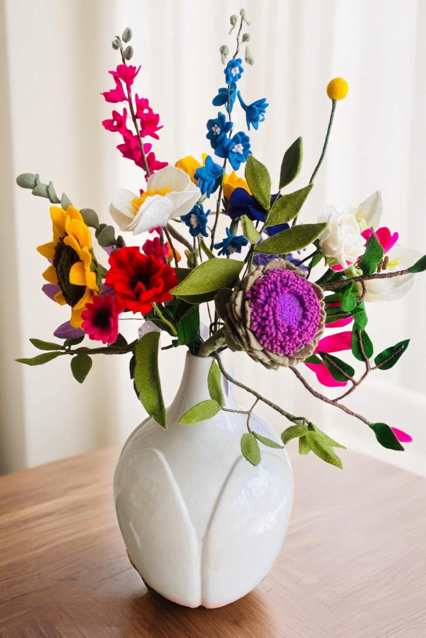 Grootte: 15-17 handgemaakte viltbloemen plus bladgroen