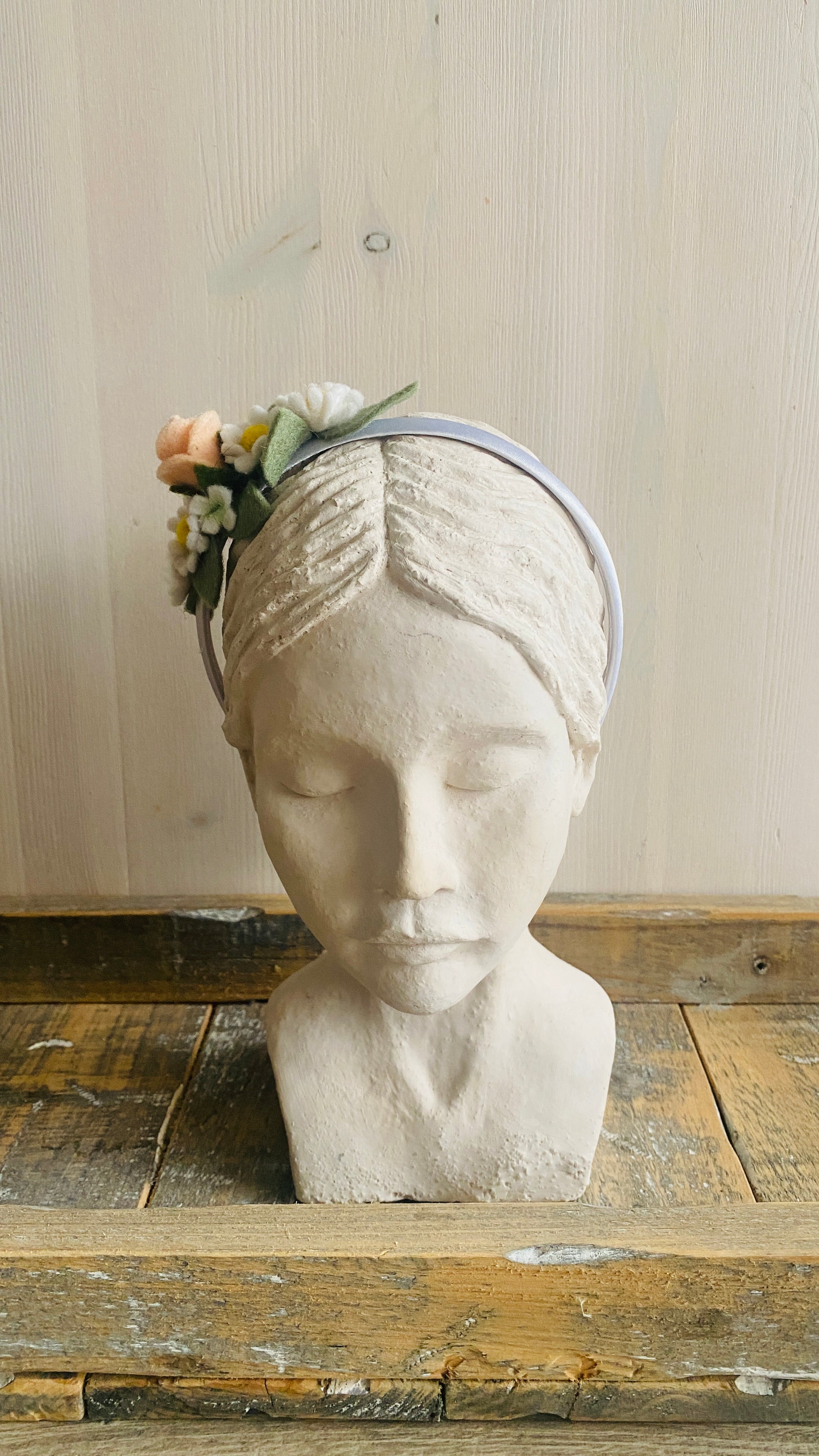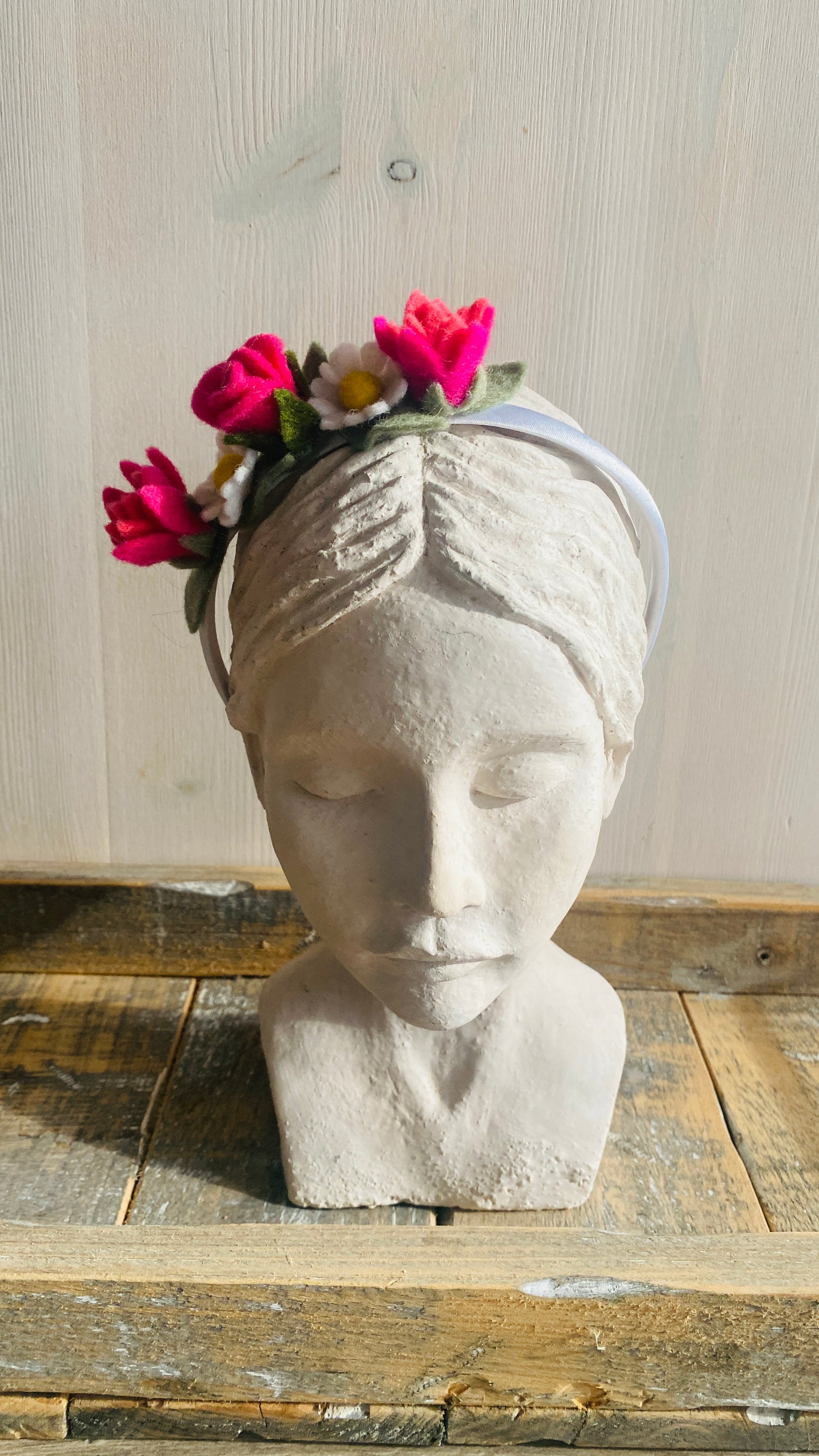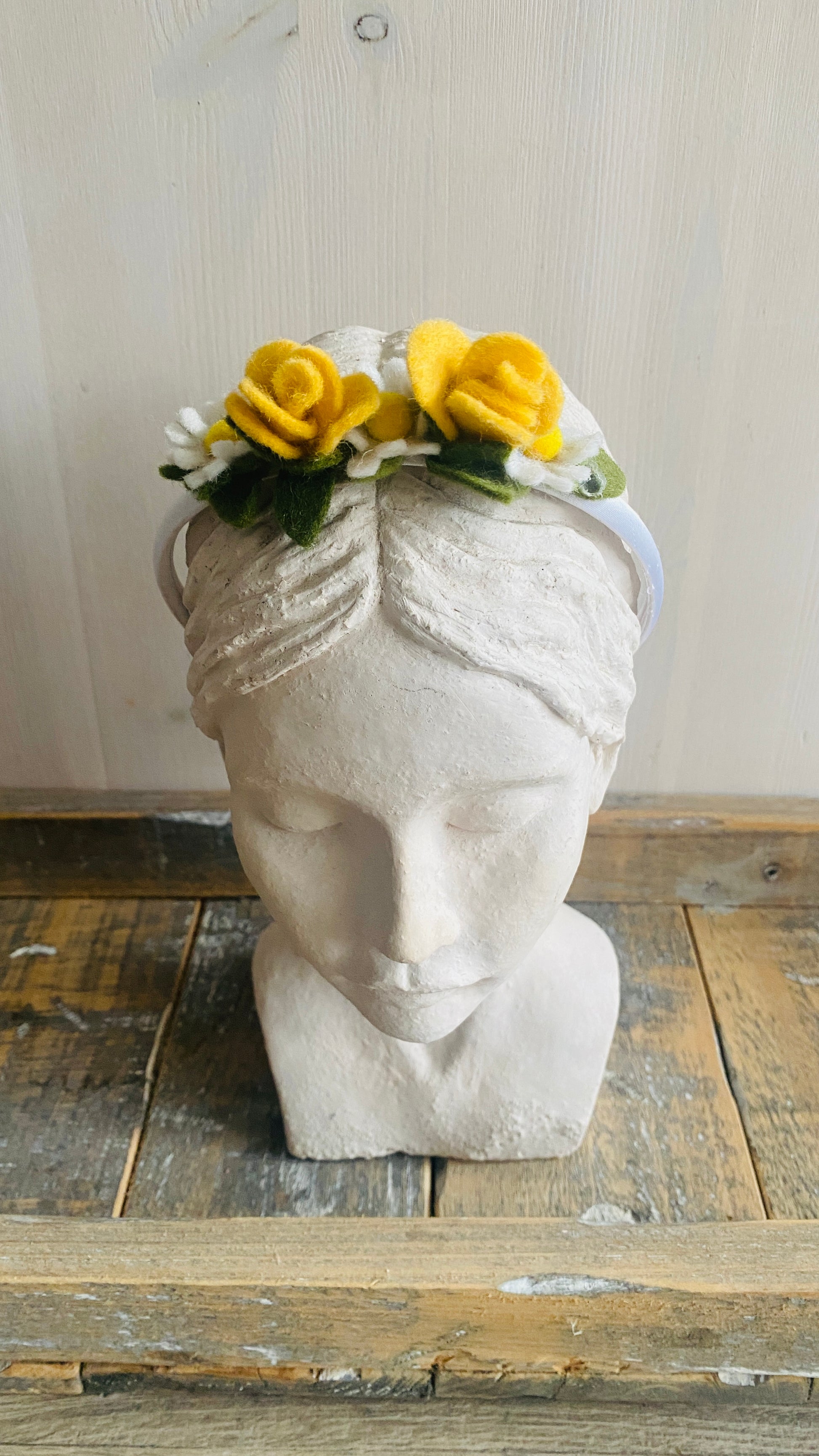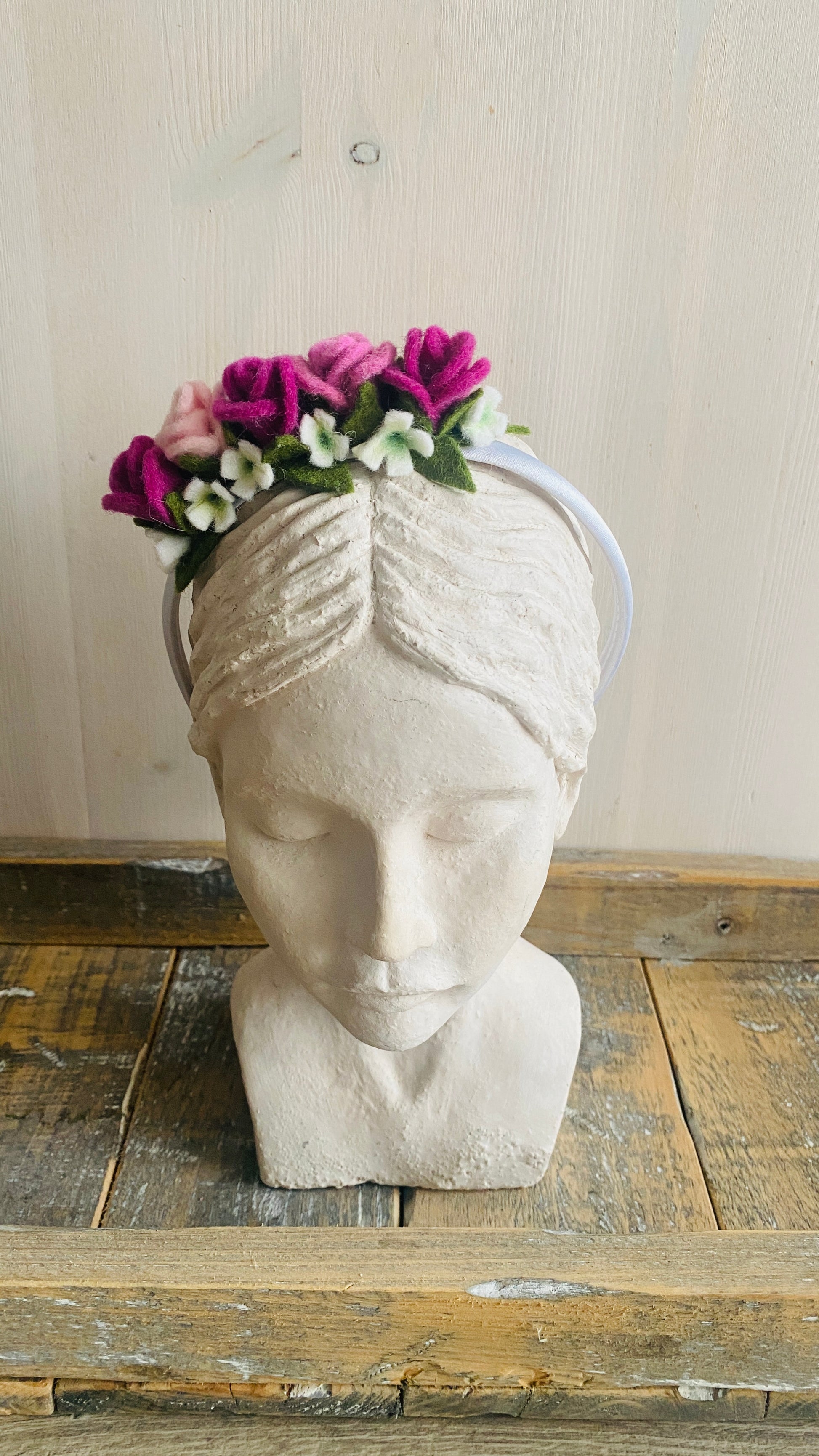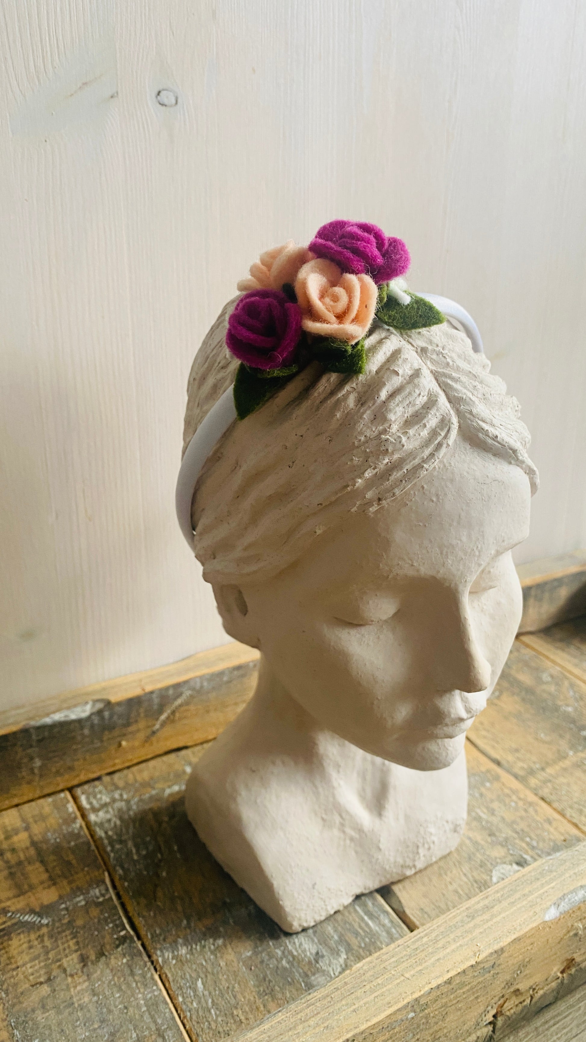 Een vrolijke look met deze handgemaakte haarband vol zachte vilten bloemen.