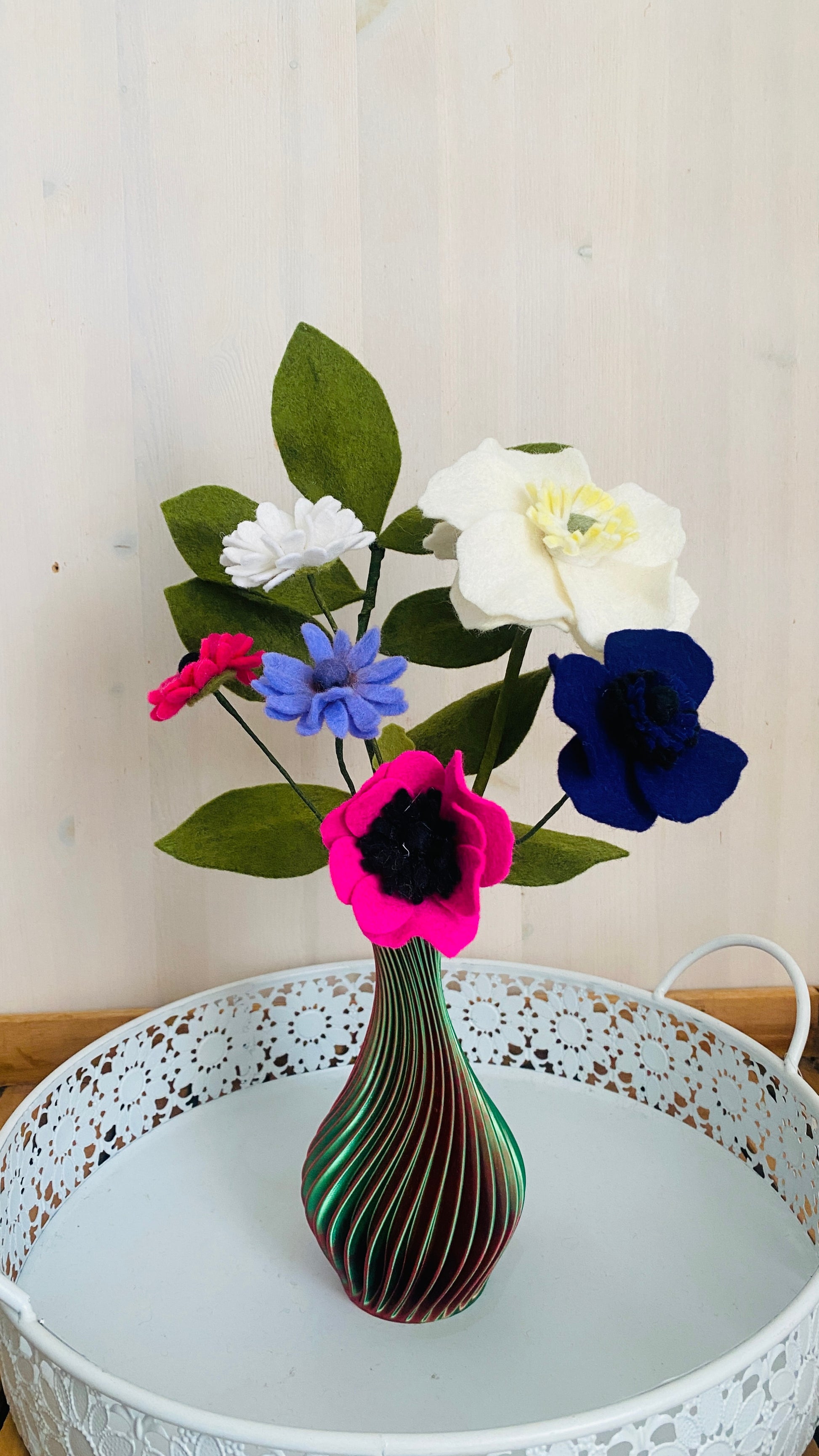 Een levendig boeket van vilt met margrieten, anemonen en groen blad. Tijdloos en vrolijk.