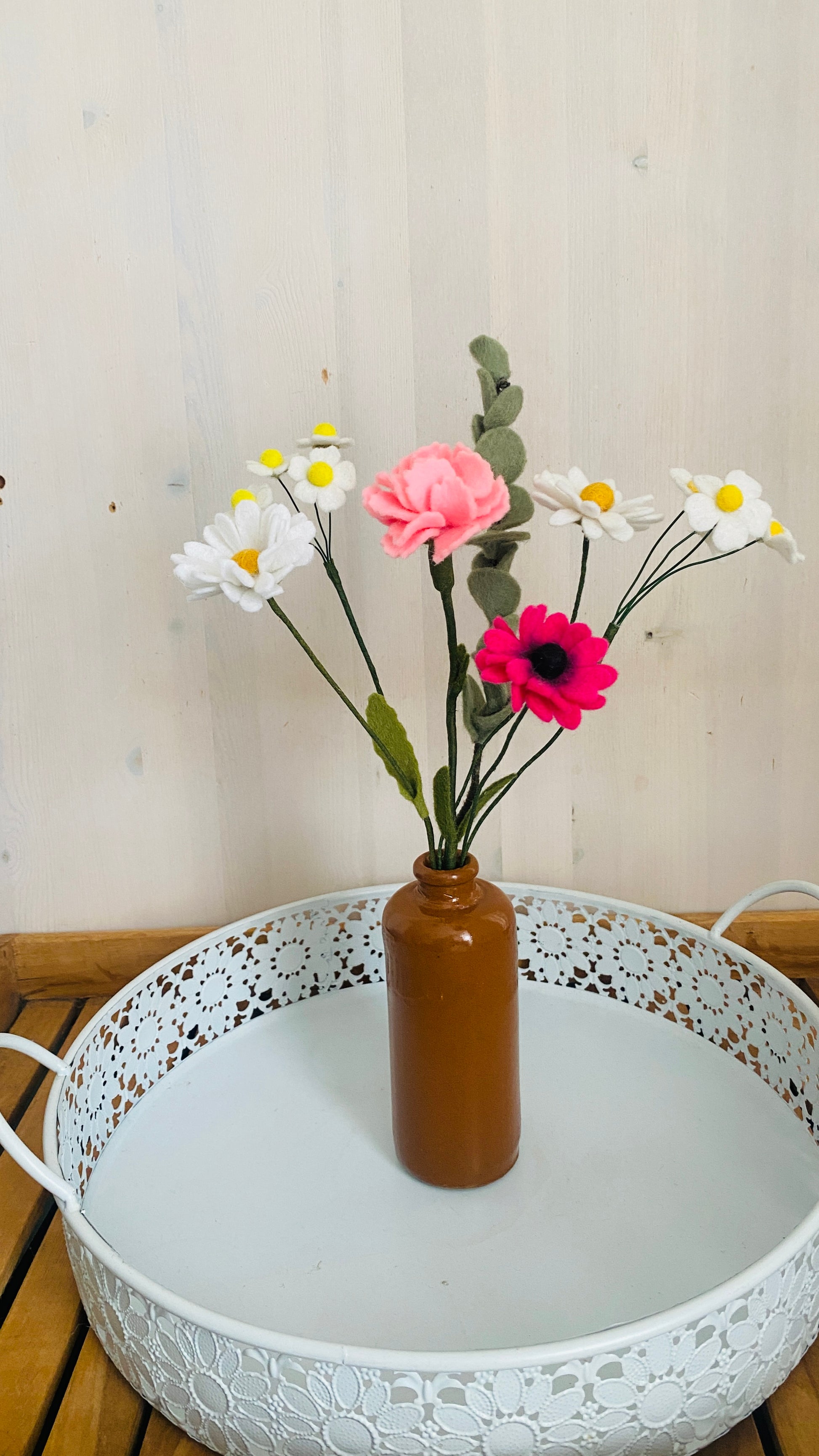 Boeket van vilten margrieten, kamille met eucalyptus. Duurzaam en sfeervol.