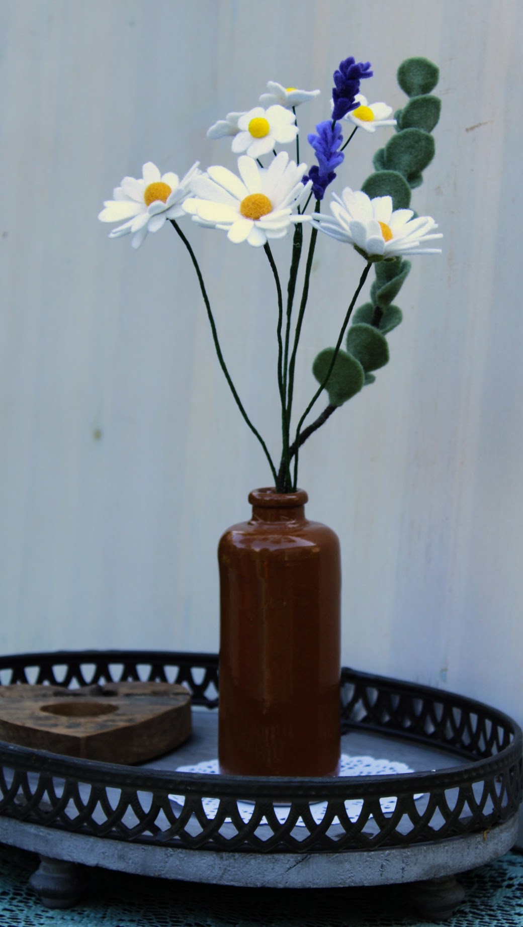 Handgemaakt vilten boeket met margrieten en lavendel, perfect voor een fris accent in huis