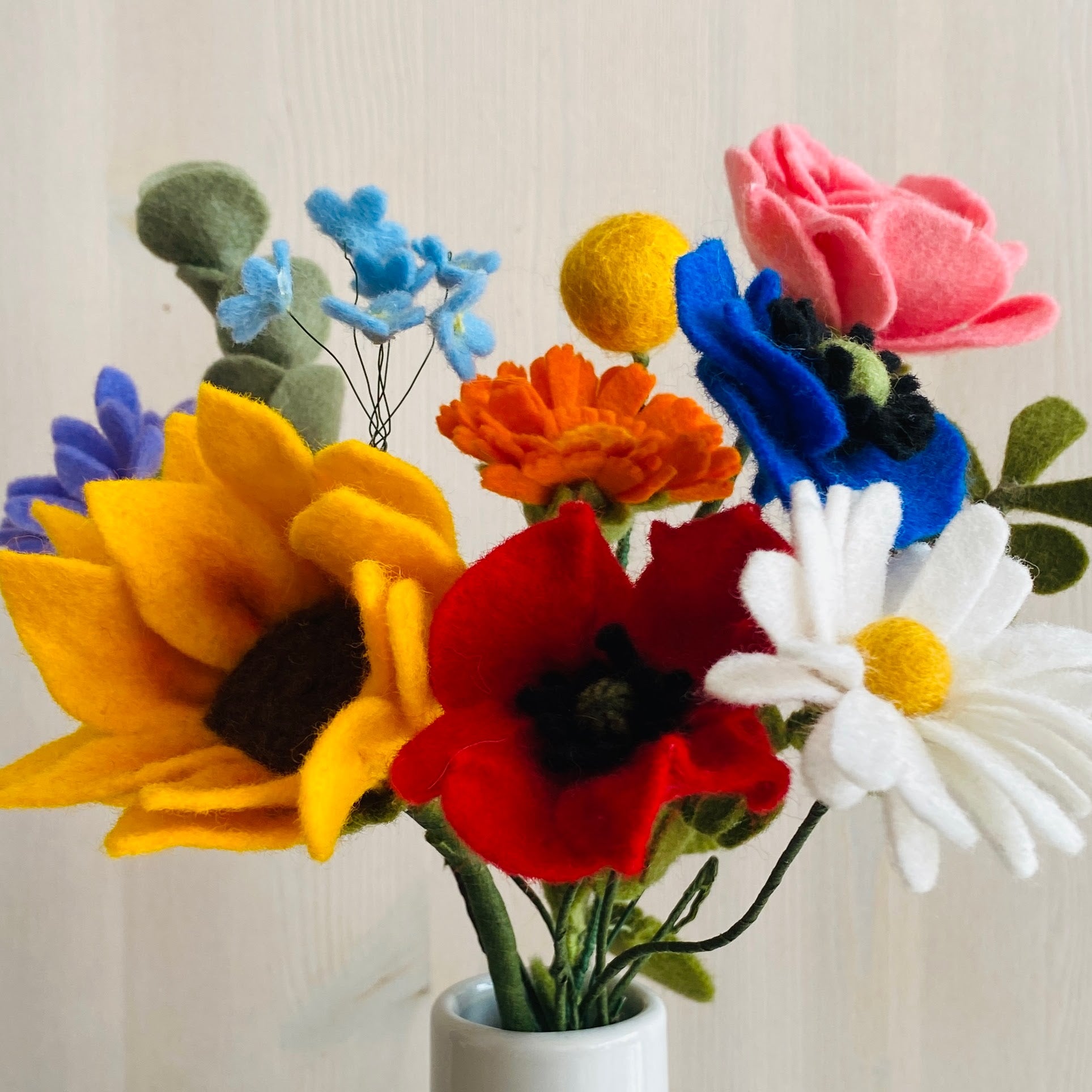 Grootte boeket: 8-10 handgemaakte viltbloemen plus bladgroen