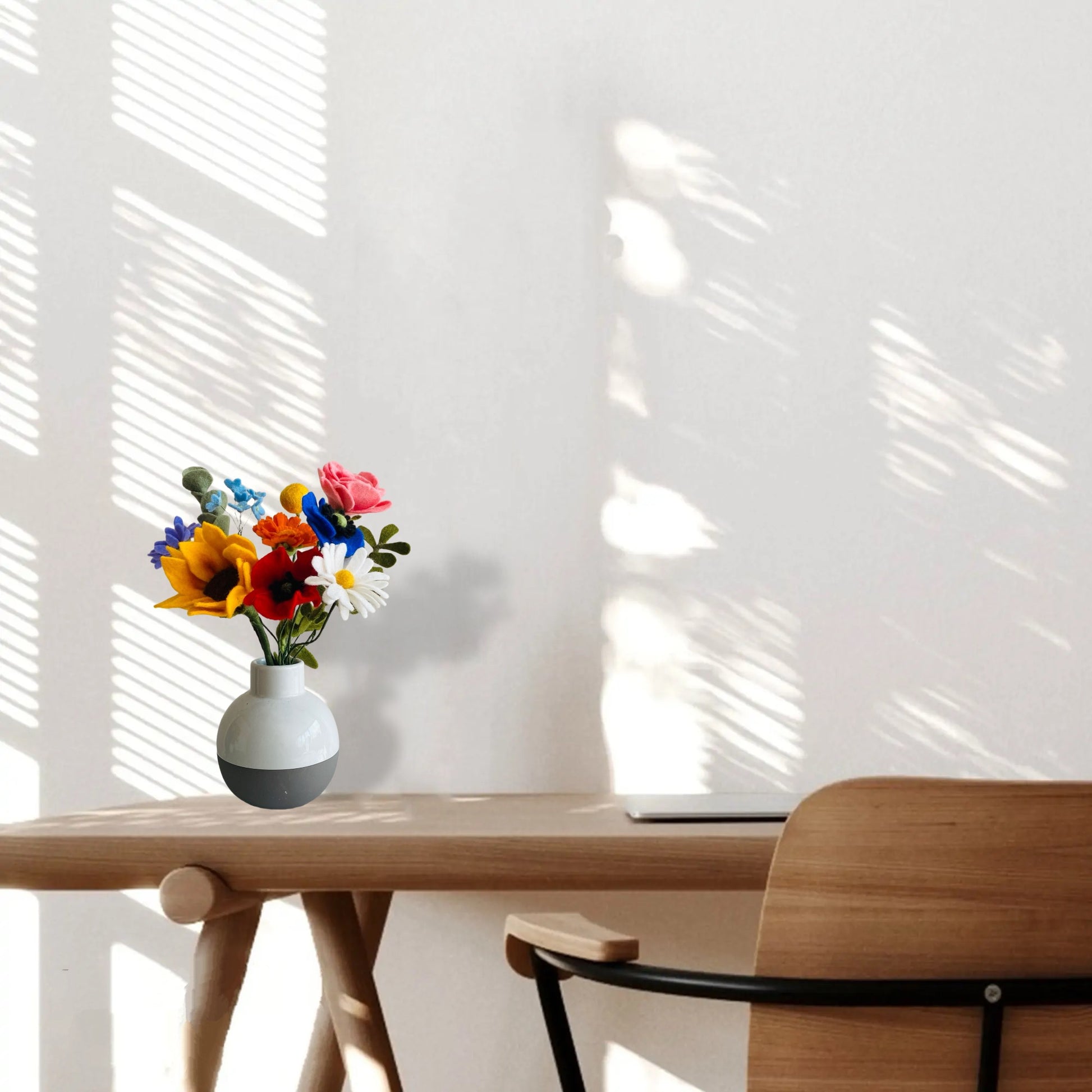 Het Compact-abonnement is perfect voor wie een subtiele touch van vrolijkheid wil. Dit boeket bevat een compact arrangement van zorgvuldig met de handgemaakte viltbloemen. Ideaal voor tafels, een bureau of als duurzaam cadeau.